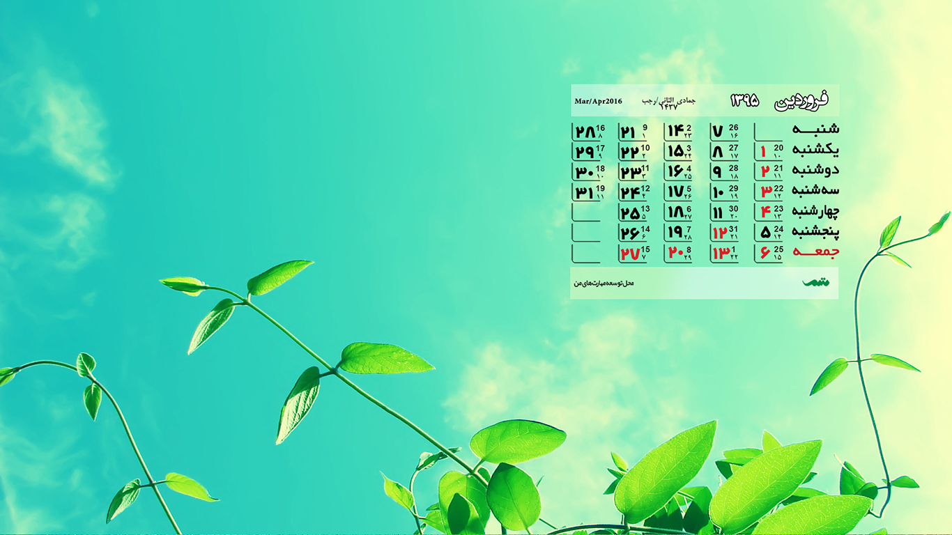 با توجه به استقبال دوستان عزیزمان از مجموعه تصاویر پس زمینه برای دسکتاپ کامپیوتر در دی ماه ۹۴ و مجموعه تصاویر پس زمینه برای دسکتاپ کامپیوتر دربهمن ماه ۹۴ و مجموعه تصاویر پس زمینه برای دسکتاپ کامپیوتر دراسفند ماه ۹۴ این بار هم مجموعه تصاویر پس زمینه جدیدی را به همراه تقویم فروردین ماه ۹۵ برای شما در نظر گرفته ایم.
